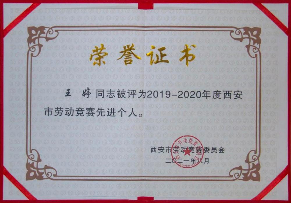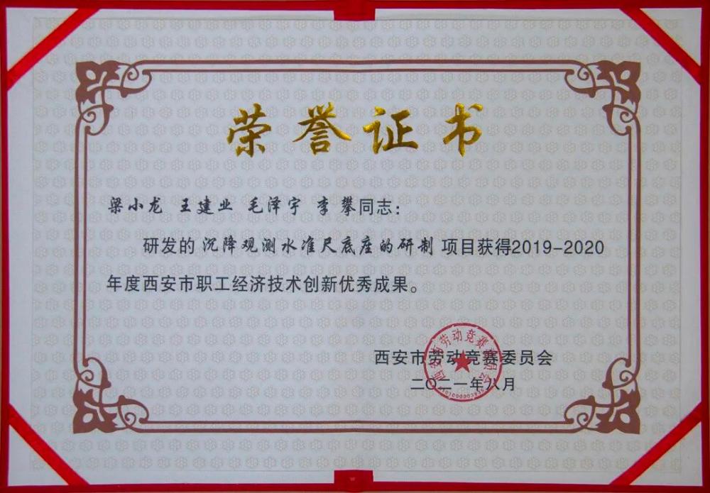 其中,王婷荣获“2019—2020 年度西安市劳动竞赛先进个人”;梁小龙牵头,王建业、毛泽宇、李攀共同研发的“沉降观测水准尺底座的研制”以及曹杰牵头,刘智、周远强、陈冉升共同研发的“填方造地工程综合压实填筑技术与方法”等两项职工技术创新成果被评为“2019—2020 年度西安市职工经济技术创新优秀成果”。