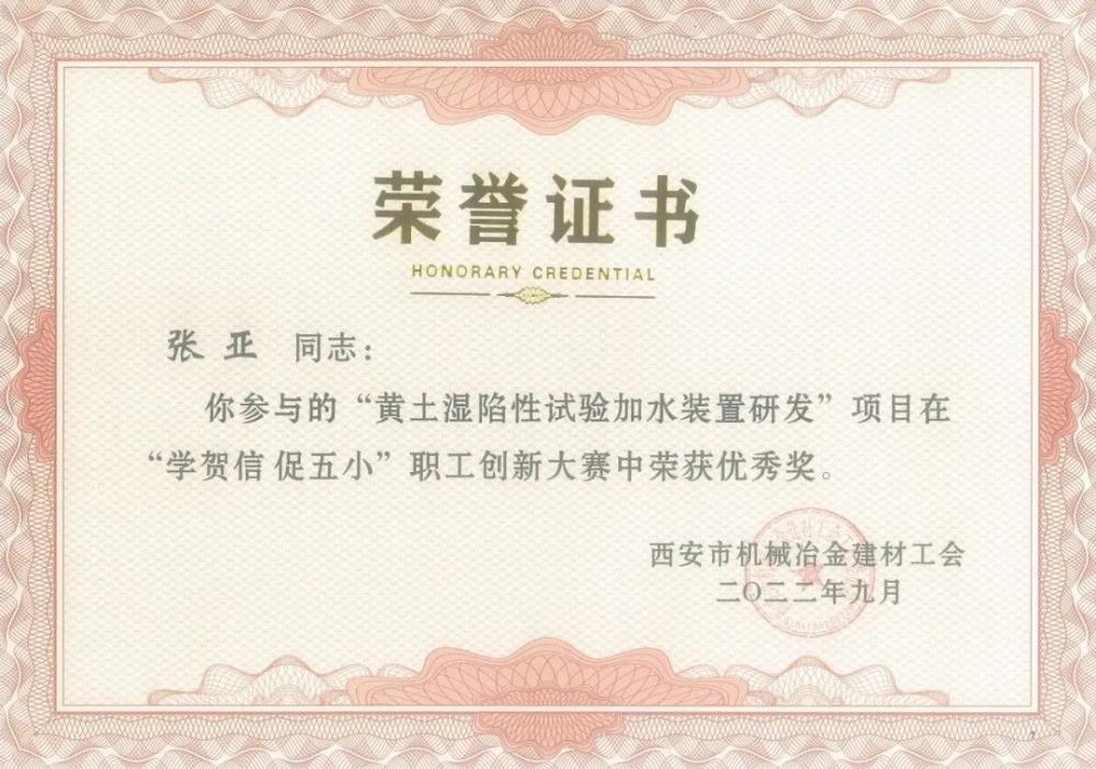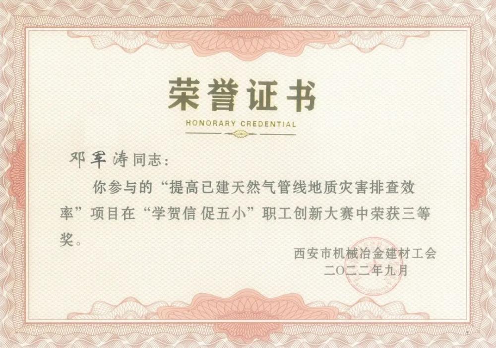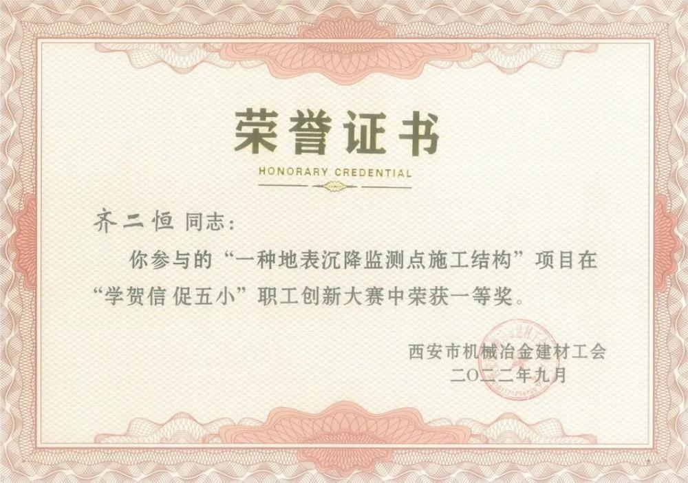 近日,西安市机械冶金建材工会发布《关于表彰2022年度职工“学贺信新、促五小”创新大赛优秀成果和优秀组织单位的通报》,机勘院“一种地表沉降监测点施工结构”荣获创新大赛优秀成果一等奖、“提高已建天然气管线地质灾害排查效率”荣获创新大赛优秀成果三等奖、“黄土湿陷性试验加水装置研发”荣获创新大赛优秀成果优秀奖,机勘院工会荣获优秀组织单位,机勘院工会主席王东红等两位同志荣获优秀组。