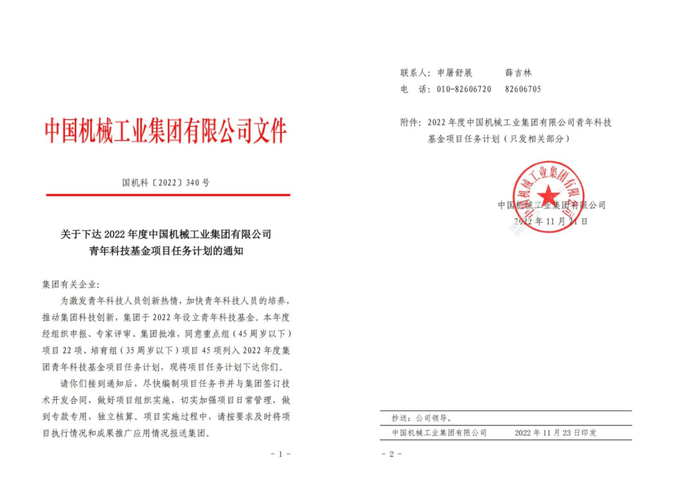 近日,国机集团下达了2022年度中国机械工业集团有限公司青年科技基金项目任务计划的通知(国机科〔2022〕340号),公布了2022年青年科技基金项目名单。