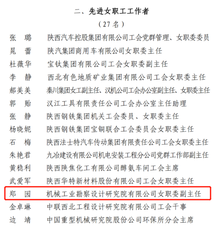近日,陕西省机械冶金建材工会发布了《关于表彰陕西省机械冶金建材系统工会先进女职工组织和女职工工作者、先进女职工集体和个人的决定》(陕机冶建工发【2023】11号),我院两名女职工受到表彰。
