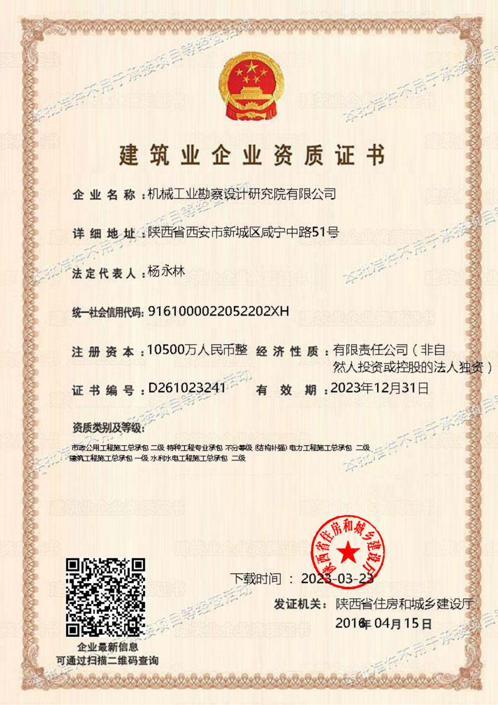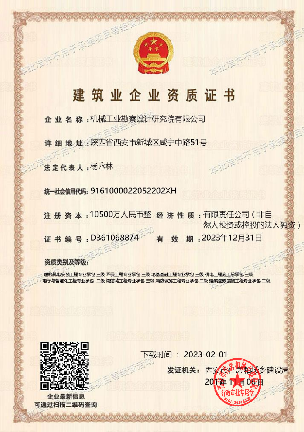 经陕西省住房和城乡建设厅、西安市住房和城乡建设局核准,机勘院成功增项水利水电工程施工总承包二级,特种工程专业承包 不分等级(结构补强),电子与智能化工程专业承包二级三项资质。