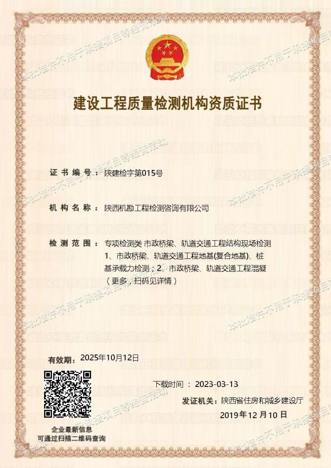 经陕西省质量技术监督局资质认定评审、陕西省住房和城乡建设厅审核批准,机勘院下属子公司陕西机勘工程检测咨询有限公司(简称:陕西机勘检测公司)顺利获批市政工程原材料、成品、构配件的进场见证取样检测资质。至此,陕西机勘检测公司已拥有:一、专项类资质:地基基础工程检测、主体结构工程检测、钢结构工程检测、民用建筑节能检测、市政桥梁、轨道交通工程结构现场检测、市政道路工程检测;二、见证取样类资质:房屋建筑土建工程建筑材料、构配件进场见证取样检测;市政工程原材料、成品、构配件的进场见证取样检测资质;三、综合类资质:既有建筑物结构、使用功能、安全可靠性综合检测、评估、鉴定;四、物探类:业务范围涵盖隧道衬砌、挡土墙质量检测;岩溶、管线探测;超前地质预报;排水管道检测与评估。