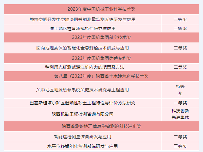 机勘院多个科研成果获得业界认可,荣获2023年度“机械工业科技进步奖”“中国机械工业集团科学技术奖科技奖和专利奖”“第八届陕西省土木建筑科学技术奖”“陕西省测绘科技进步奖”等多项奖项。
