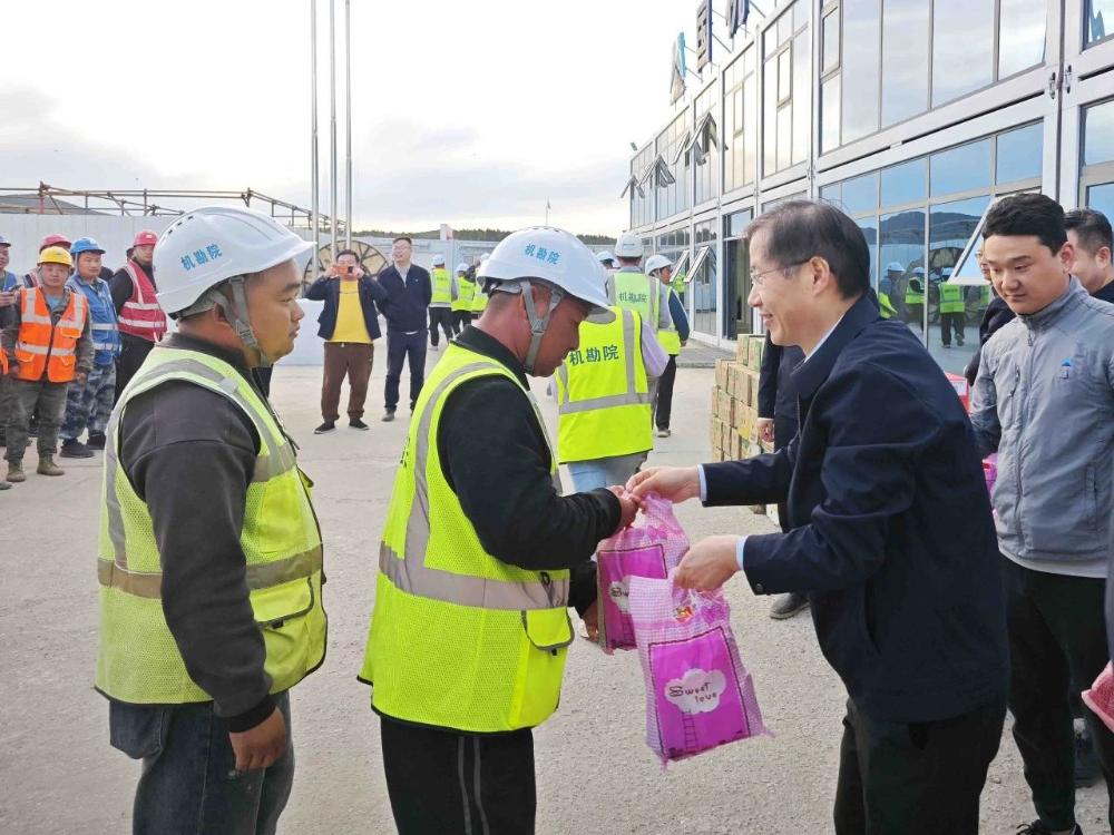 在工地现场,邵雪奎一行代表机勘院向节日期间坚守一线的全体公司职工和分包方施工人员送上中秋节慰问,感谢大家的辛勤付出,并致以节日最亲切的问候和最美好的祝愿!