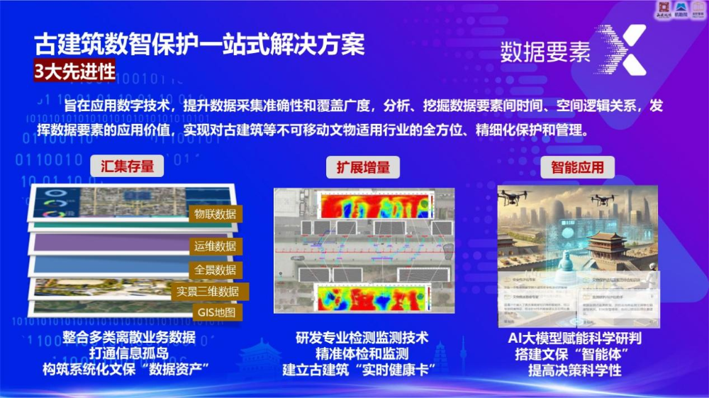方案团队将多年来在西安城墙的研究成果提炼转化,依托“数字方舱”综合管理平台为基石,通过“1个数据底座”“1套管理平台”互联互通,将城墙隐患排查成果、监测研判成果、预防性保护成果等应用于“4类核心场景”,充分发挥数据要素的应用价值,着力推进科学技术对文物事业发展的支撑引领作用,以数据为关键要素的数字文保产业,推出“古建筑数智保护一站式解决方案”,实现对不可移动文物中古建筑、古遗址等文物保护领域及生态保护、自然遗产景区、水利水域风景区、文化旅游景区等领域的科学化精细化、系统化保护和管理。