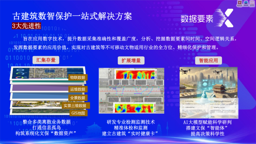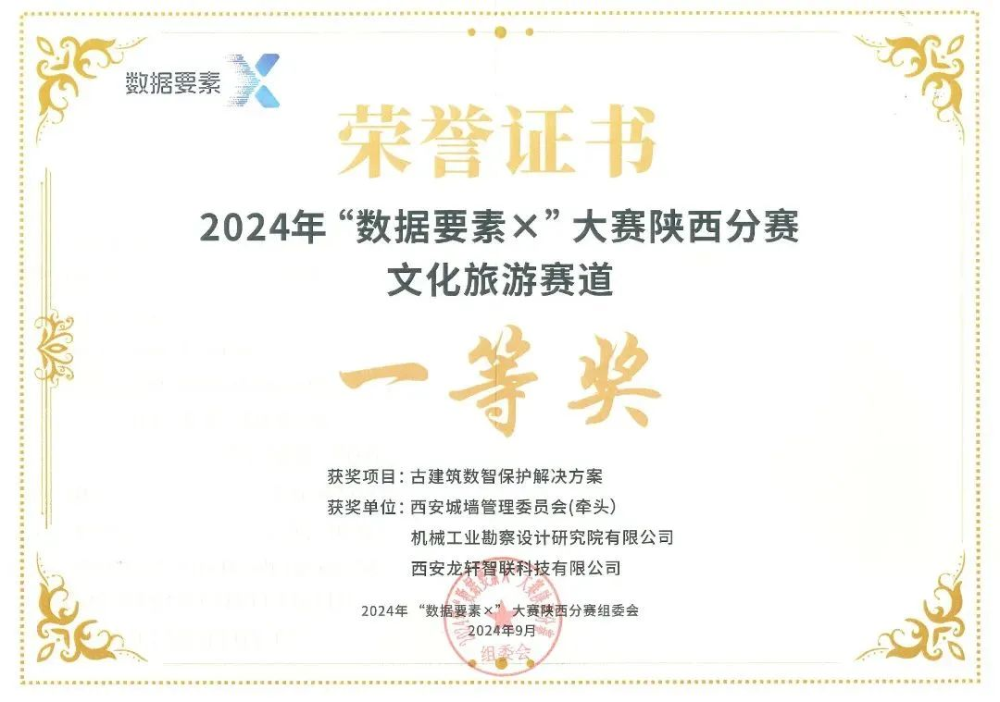 在此基础上,机勘院文保院推出了“古建筑数智保护解决方案”,该方案不仅适用于不可移动文物中的古建筑与古遗址保护,还广泛拓展至生态保护、自然遗产景区、水利水域风景区及文化旅游景区等领域,实现了科学化、精细化与系统化的保护与管理。该成果在2024年“数据要素X”大赛陕西分赛的文化旅游赛道上荣获一等奖。