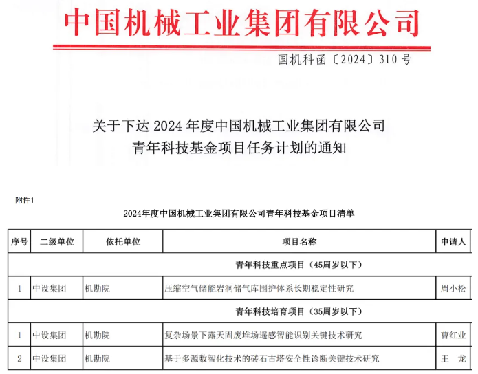 近日,国机集团公布了2024年度中国机械工业集团有限公司青年科技基金项目立项名单,机勘院荣获1项青年科技重点项目、2项青年科技培育项目。