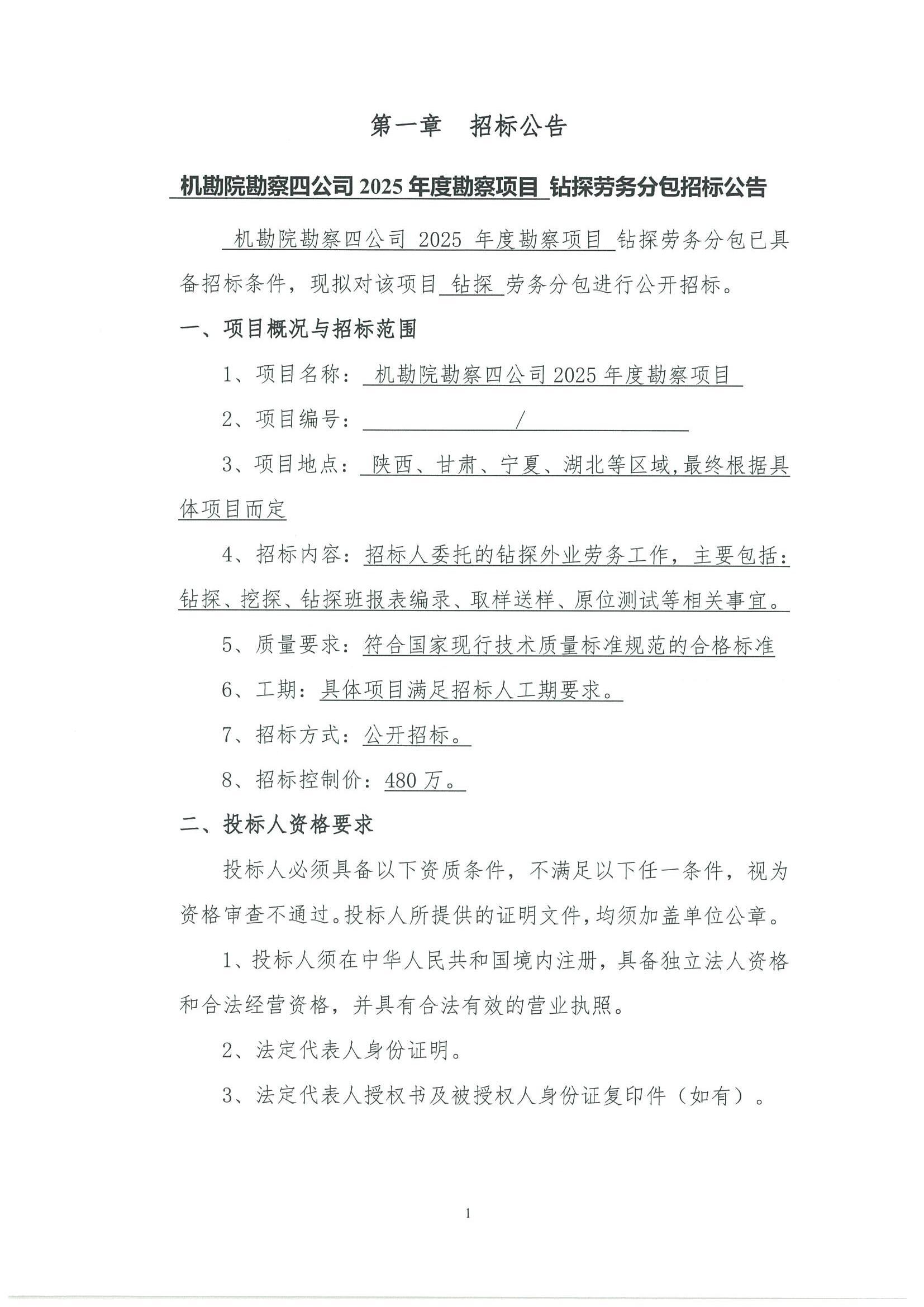 机勘院勘察四公司2025年度勘察项目钻探劳务分包招标公告