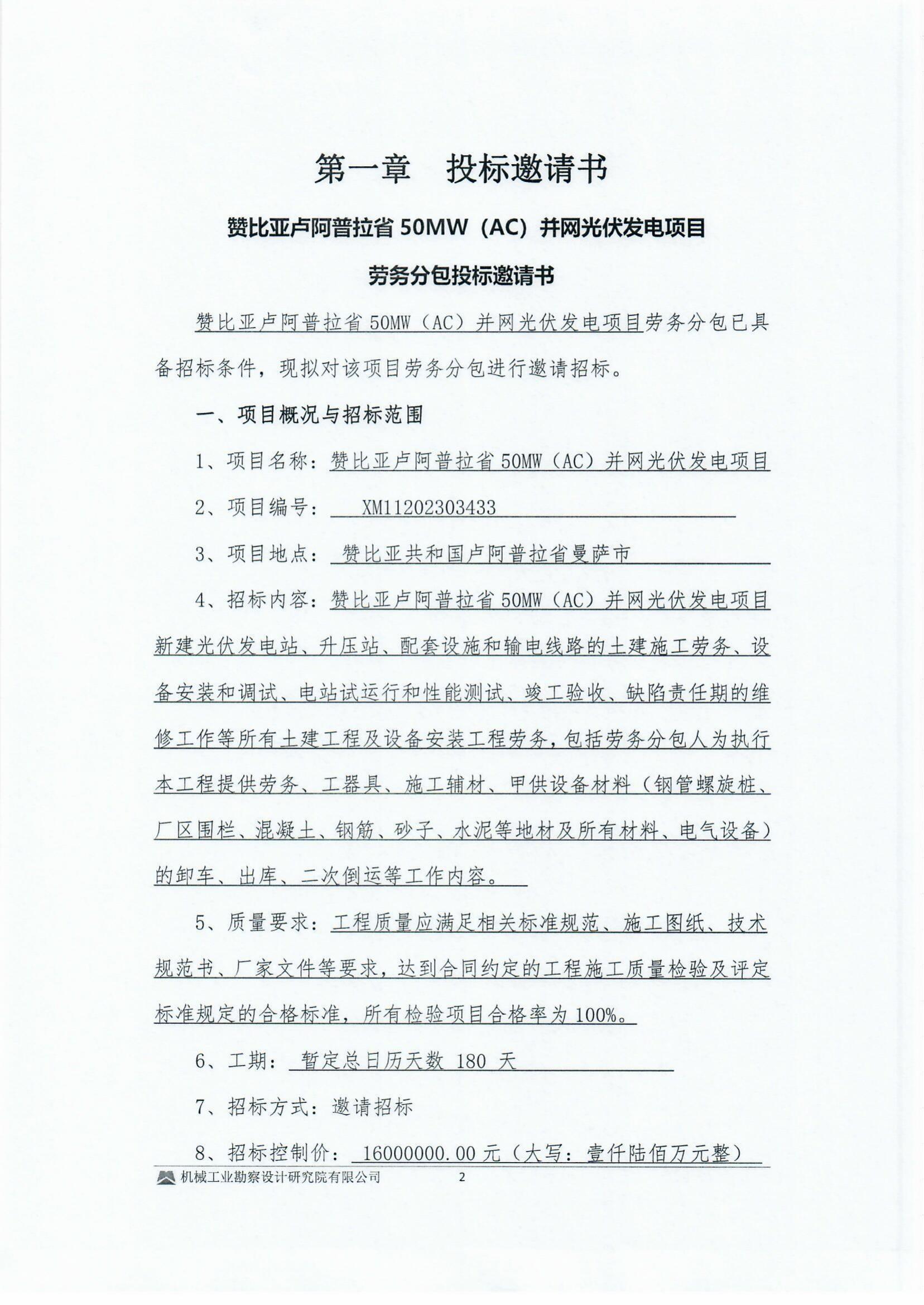 赞比亚卢阿普拉省50MW(AC)并网光伏发电项目劳务分包-投标邀请书