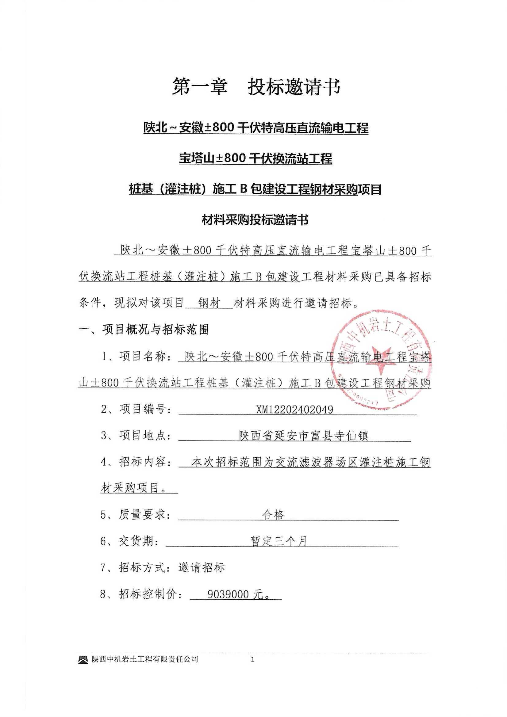 陕北~安徽±800千伏特高压直流输电工程宝塔山±800千伏换流站工程桩基(灌注桩)施工B包建设工程钢材采购-投标邀请书
