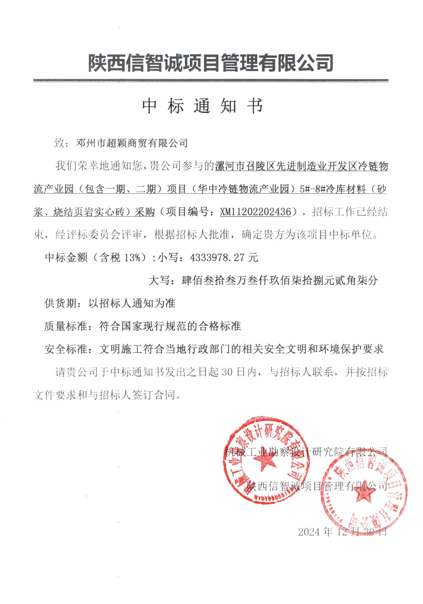 漯河市召陵区先进制造业开发区冷链物流产业园(包含一期、二期)项目(华中冷链物流产业园)5#-8#冷库材料(砂浆、烧结页岩实心砖)中标通知书