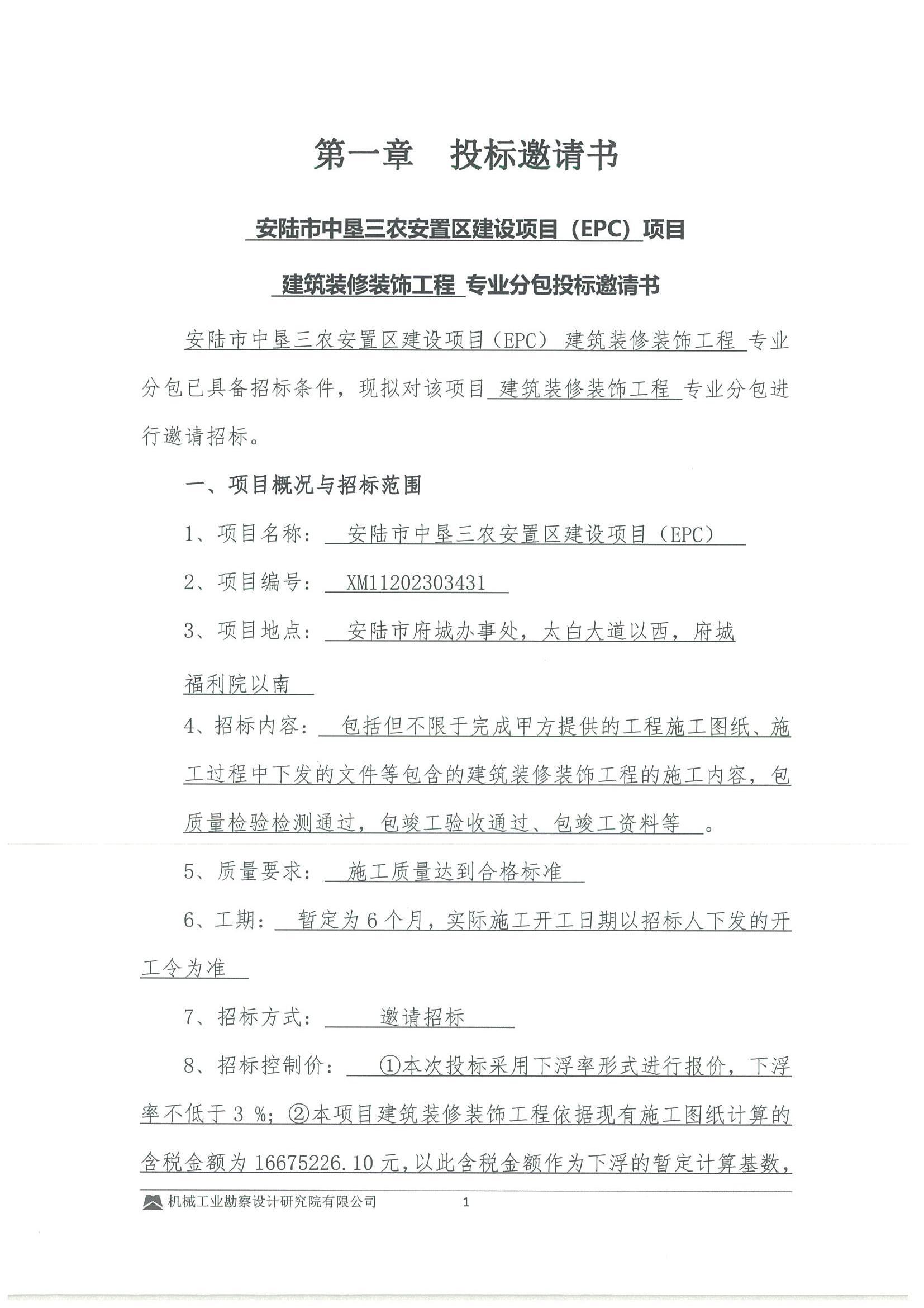 安陆市中垦三农安置区建设项目(EPC)---建筑装修装饰工程专业分包投标邀请书