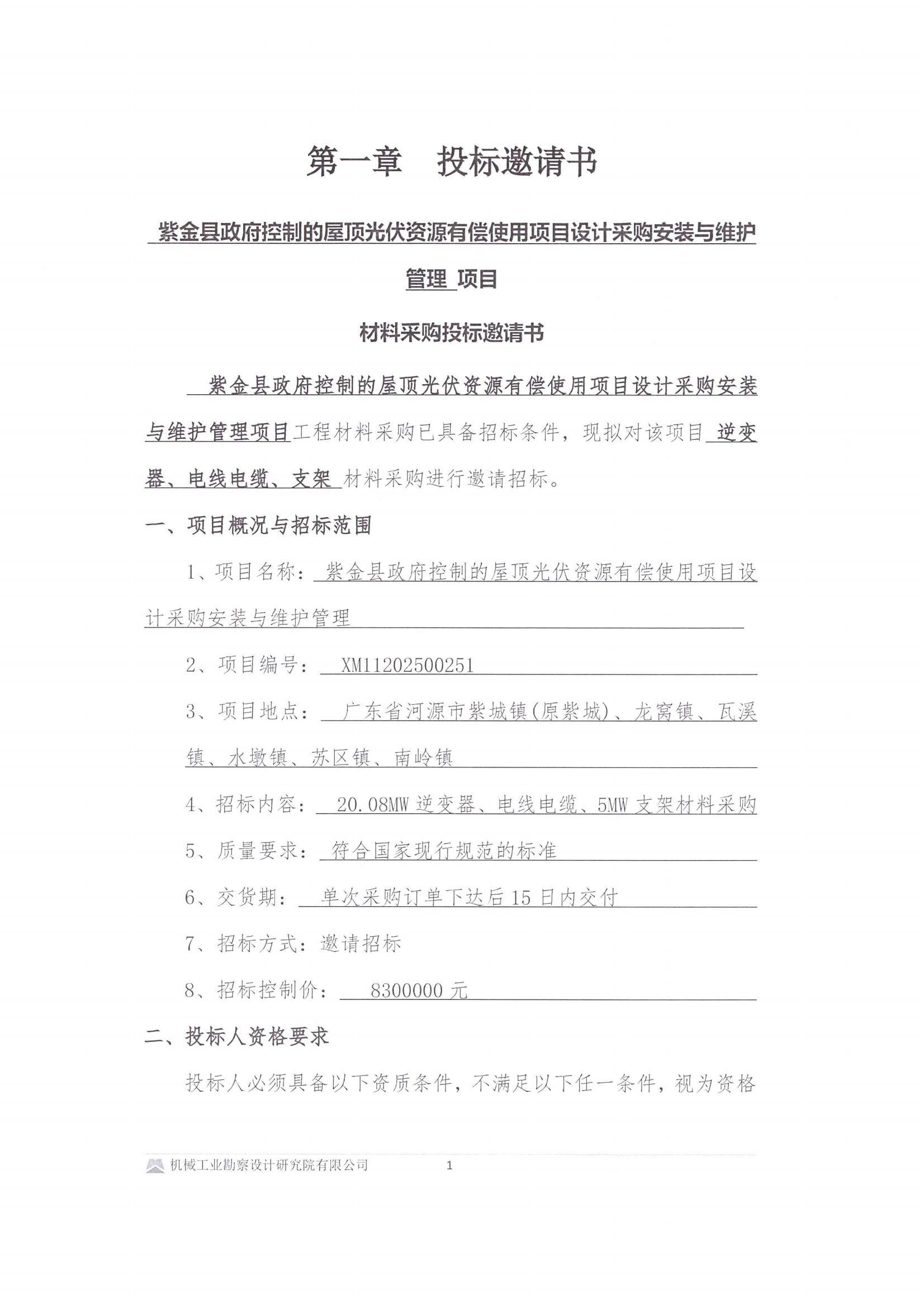 紫金县政府控制的屋顶光伏资源有偿使用项目设计采购安装与维护管理项目逆变器、电缆、支架采购-投标邀请书