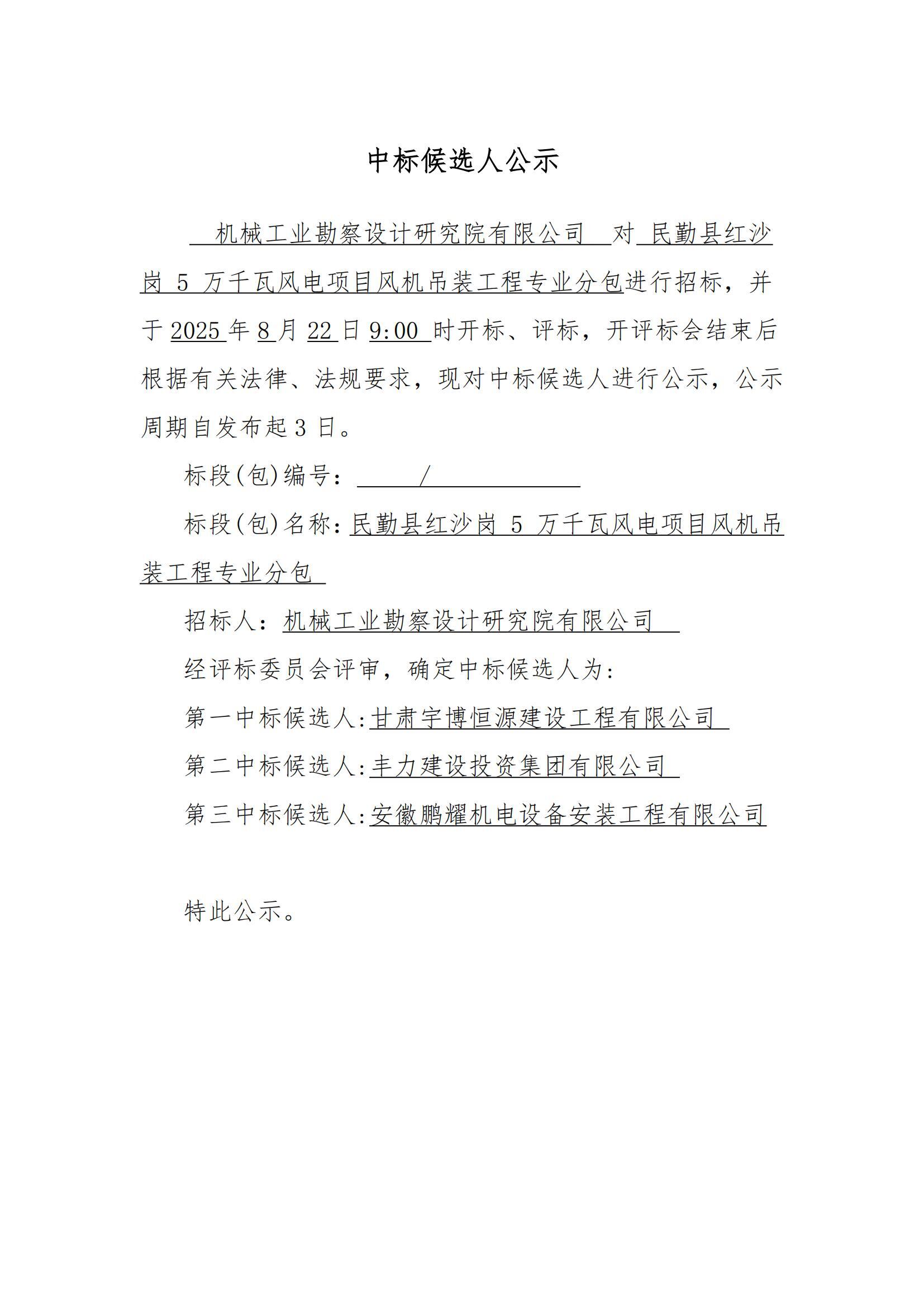 民勤县红沙岗5万千瓦风电项目风机吊装工程专业分包中标候选人公示