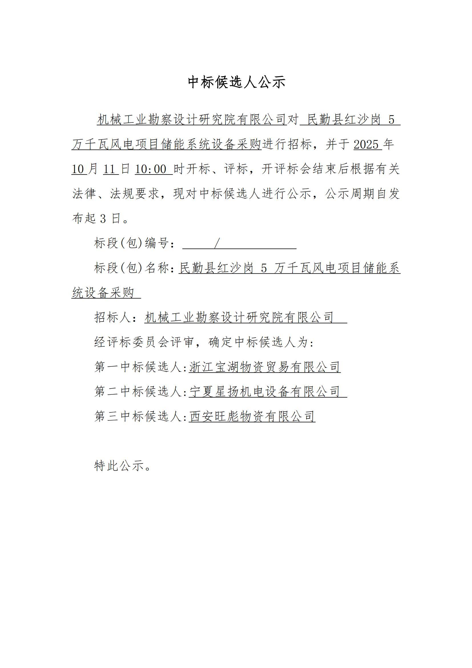 民勤县红沙岗 5 万千瓦风电项目储能系统设备采购中标候选人公示