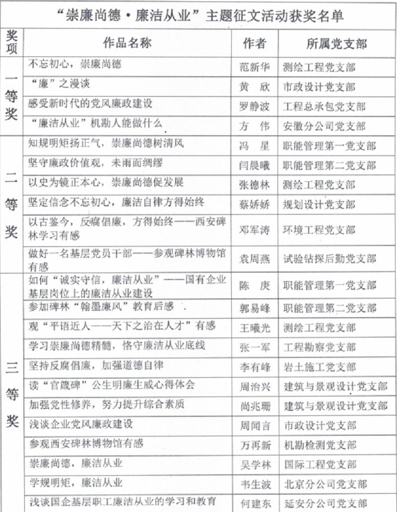 经过两个多月的精心组织和各党支部的大力配合,广大党员干部和职工群众积极参与,踊跃投稿,16个党支部共选送作品50余篇。经纪检监察室初评推荐,院纪委会集体讨论审议,共评选出优秀作品22篇。其中一等奖4篇,二等奖6篇,三等奖12篇,其余为鼓励奖;授予测绘工程党支部、职能管理第二党支部、建筑与景观设计党支部“优秀组织奖”。在机勘院2019年全面从严治党工作会议上对一等奖和优秀组织奖进行了表彰。