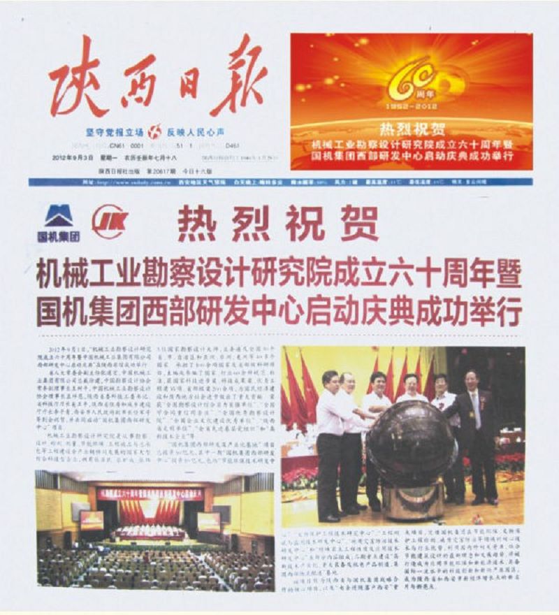 9月3日的报道以《热烈祝贺机械工业勘察设计研究院成立六十周年暨国机集团西部研发中心启动庆典成功举行》为题,指出:“2012年9月1日,‘机械工业勘察设计研究院成立六十周年暨中国机械工业集团有限公司西部研发中心启动庆典’在陕西宾馆成功举行。省人大常委会副主任张道宏,中国机械工业集团有限公司总裁徐建,中国勘察设计协会常务副理事长王树平,中国机械工业勘察设计协会理事长孟祥恩,陕西省委科技工委书记、省科技厅厅长奚正平,陕西省住房和城乡建设厅厅长李子青,西安市人民政府副市长任军号等到会祝贺,并共同启动‘国机集团西部研发中心’项目”等内容。
