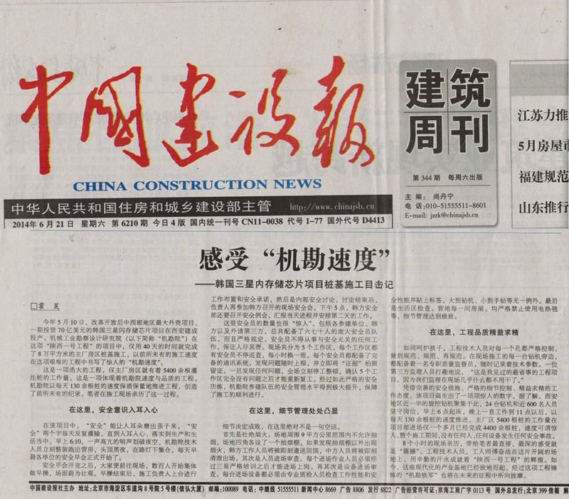 今年5月10日,改革开放后中西部地区最大外资项目、一期投资70亿美元的韩国三星闪存芯片项目在西安建成投产。我院在这项“陕西一号工程”的项目中,40天完成了8万平方米的主厂房区桩基施工(5400余根灌注桩),以前所未有的施工速度与卓越品质在这项艰难的工程中书写了惊人的“机勘速度”,为韩国三星西安闪存项目如期建成投产做出了积极贡献。6月21日,《中国建设报》对此进行了重点报道。