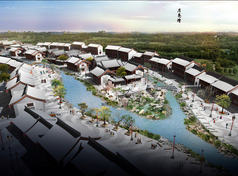 整个街区从南至北分别以一花五叶之精神划分为五个景观团,分别为:一、禅风接引组团。以南入口四柱三牌楼门为引导,以景观大道为核心,结合两侧对称矗立的商业服务性建筑,试图呈现出禅风博大、广纳众生之精神及博畅开放、虚怀迎宾之姿态;二、禅运一脉组团。以唐风接引亭为引导,沿曲折河道布置进退有致的各色建筑,结合依依杨柳,古风雕塑、店招旗幌,试图呈现出禅运长久,绵延不绝之精神及水街悠悠,一步一景,柳暗花明之精致;三、禅业繁盛组团。水面至此豁然开朗,以临水码头为核心,结合一周店铺,亲水平台,围合广场,试图呈现出禅门深广、禅业繁盛之精神及画舫舟楫,商埠云集,济济一堂之景象;四、禅舟一叶组团。以船型河州为核心,岛上庭院深深,别有洞天,港湾如月,长桥卧波。试图呈现出达摩祖师苇舟一叶,度己度人之情怀及盈盈一水、静谧安然、扁舟独立之景象;五、禅音回响组团。河道至此转为细流,街市亦为之离水登岸,向东一转,豁然开朗,最终却又以一孔莹白石枋悠然结束。试图呈现出禅门机锋,急缓随缘,余韵不绝之精神及峰回路转,别有洞天之景象。