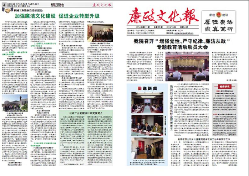 继上半年组织全体中层以上干部赴检察机关开展廉政教育后,10月28日,院纪委与新城区人民检察院合办的《廉政文化报》正式出版。该期以整版篇幅,以《加强廉洁文化建设,促进企业转型升级》为题,介绍了我院积极加强廉洁文化建设、构筑廉洁从业“笼子”、营造风清气正氛围、促进企业健康发展走向世界的做法。