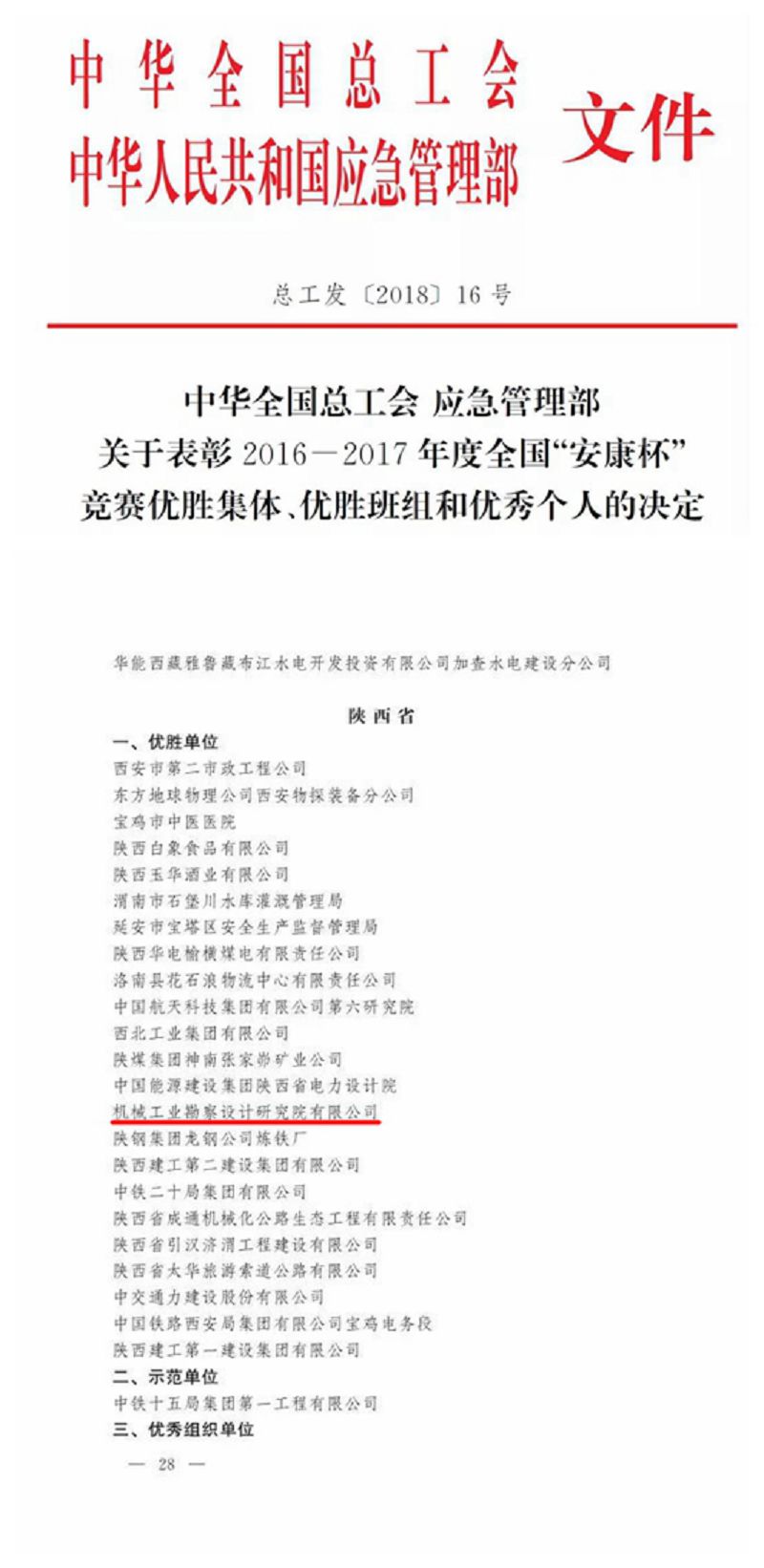 【概要描述】 【概要描述】 6月12日,中华全国总工会、国家应急管理部在京召开全国安康杯竞赛表彰暨经验交流电视电话会议,我院作为陕西省23家单位之一获评“全国‘安康杯’竞赛优胜单位”荣誉称号。