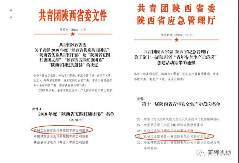 【概要描述】 【概要描述】 近日,从共青团陕西省委获悉,院团委荣获2018年度“陕西省五四红旗团委”荣誉称号,此外,勘察三公司荣获第十一届陕西省“青年安全生产示范岗”,受到共青团陕西省委和陕西省应急管理厅表彰。