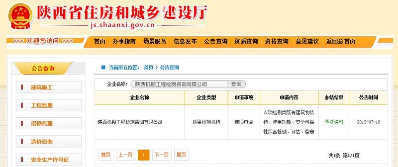 日前,经陕西省质量技术监督局资质认定评审、陕西省住房和城乡建设厅审核批准,我院所属陕西机勘工程检测咨询有限公司顺利获得既有建筑物结构、使用功能、安全可靠性综合检测、评估、鉴定资质。