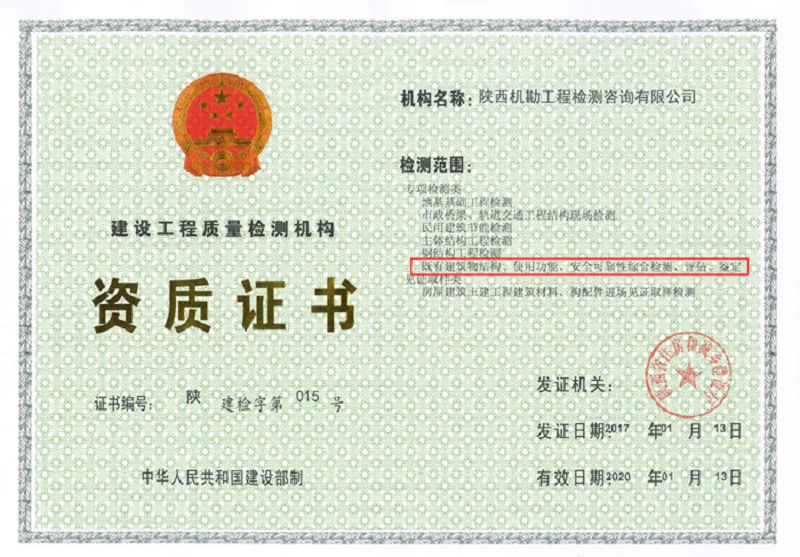 陕西机勘检测公司取得既有建筑结构鉴定资质