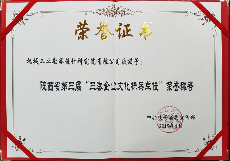 传承优秀文化,促进高质量发展。建院六十余年来,我院党政领导班子高度重视企业文化建设,与时俱进凝练文化理念、入脑入心推动生产经营。新时期“求实、创新、包容、共享”的核心文化理念,充分体现了国企初心、价值责任、发展动力、立足之本,是历史传承与开拓创新相统一,是企业发展与人文和谐两促进,实现了文化对企业的支撑力、引领力。在企业文化建设、文明单位创建领域,曾荣获 “全国企业文化建设先进单位”、全国机械行业“文明单位”及“企业文化建设先进单位”、“全国勘察行业企业文化建设先进单位”及“陕西省文明单位”、“陕西省先进集体”等称号。