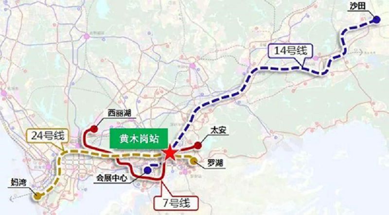 黄木岗综合交通枢纽工程(含华强北路地下空间开发工程)坐落于笋岗西路、泥岗西路、华富路、华强北路五叉路口,为既有7号线、新建14号线以及规划24号线三线换乘枢纽。14号线沿华富路和泥岗西路地下敷设,为地下三层叠侧车站,与既有7号线同台换乘;规划24号线沿笋岗西路地下敷设,为地下四层车站,与7、14号线形成节点换乘。该枢纽工程将把轨道交通建设、地面慢行系统与周边城市地块紧密地联系在一起,是打造“站城一体化”、“交通一体化”、“功能一体化”高品质城市发展空间的重要功能节点。枢纽建成后,将实现轨道交通与周边其他交通方式无缝对接,优化片区功能定位,提升片区交通运行效率,增强片区发展活力。计划2022年建成完工。