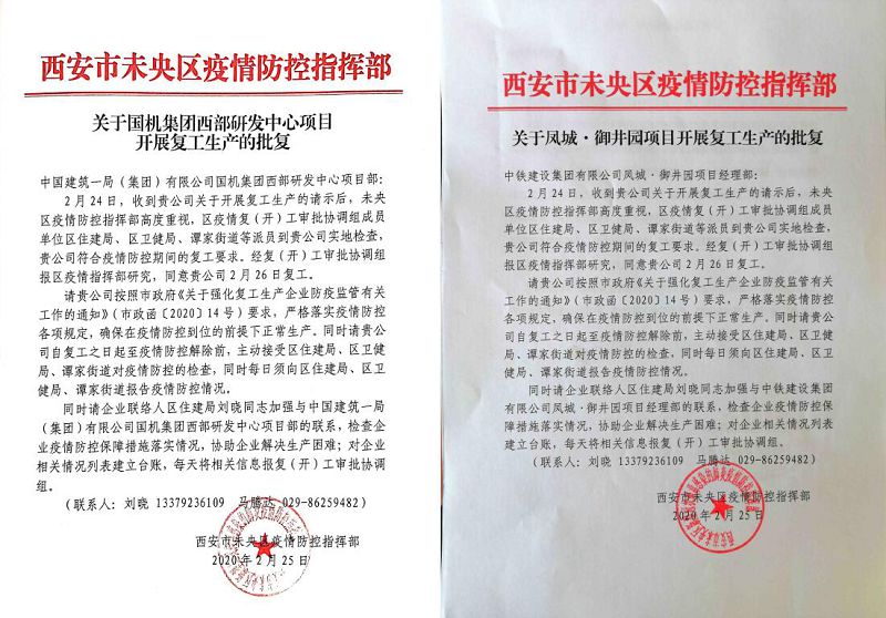2月26日,在院党委书记、董事长黄玉明的领导下,经基建办全体员工的共同努力,于今日正式取得未央区政府的复工批复文件,研发中心和住宅项目今年被正式列入陕西省重点建设项目,是未央区唯一的省级重点工程,也是全院职工关注的重大民生工程。
