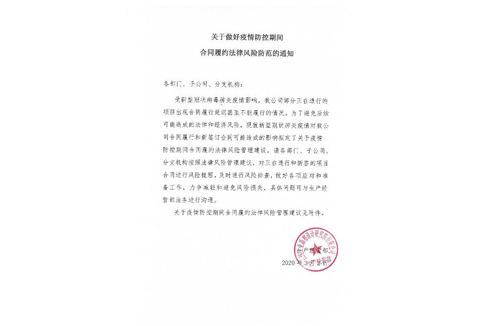 整理“关于疫情防控期间合同履约法律风险管理建议”,就新型冠状肺炎疫情对我公司合同履行可能造成的影响及应对建议进行梳理和分析,对公司生产经营做好风险防控,为公司高质量健康发展保驾护航。
