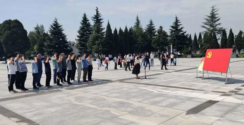 扶眉战役纪念馆位于陕西省眉县常兴镇,是为纪念在解放战争中西北战场上最大的一次战役——扶眉战役中壮烈牺牲的三千多名解放军指战员而修建的一处国家级革命烈士纪念馆。在纪念碑广场中,全体党员面向革命烈士纪念碑敬献花篮并三鞠躬。缅怀先烈后,大家面对党旗,高举右手,重温入党誓词。庄严的党旗下,大家肃穆而立,思绪仿佛回到了过去的战争岁月。面对党旗,紧握拳头,我们用响亮的声音重新宣誓了共产党员入党誓词。