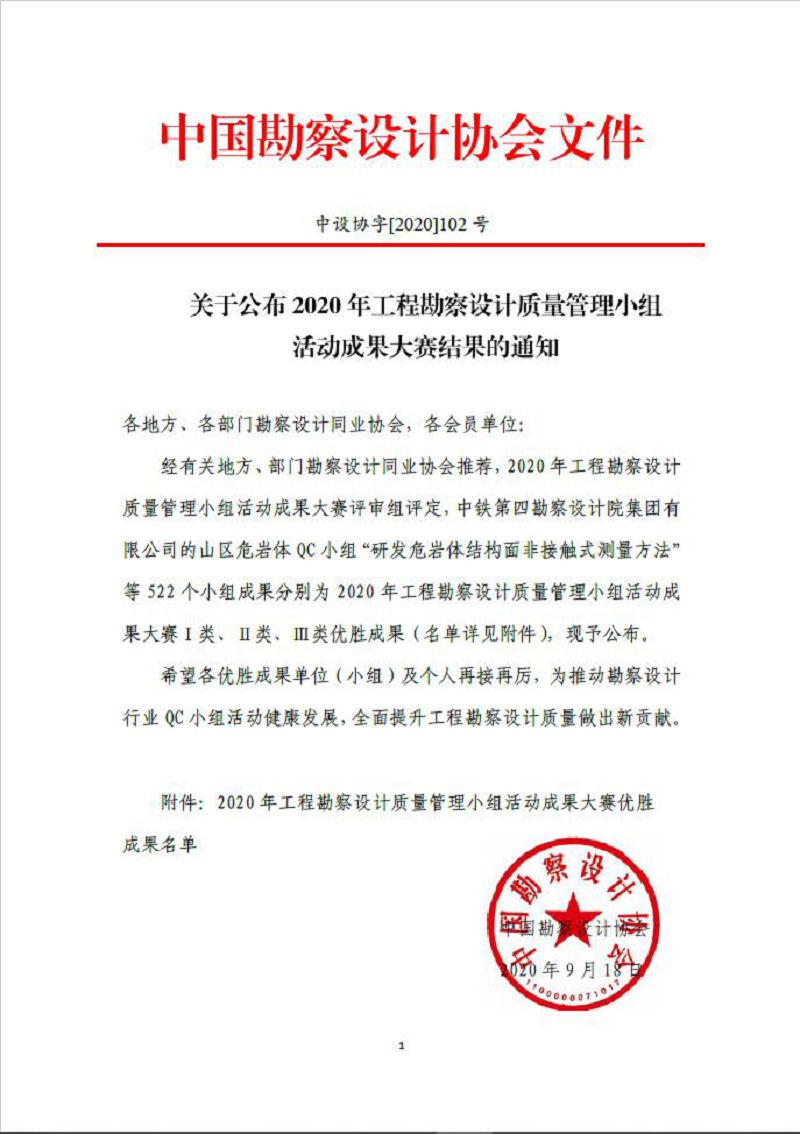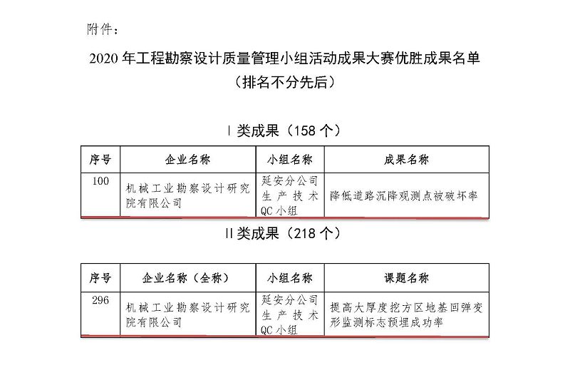 【概要描述】 【概要描述】日前,从中国勘察设计协会2020年工程勘察设计质量管理(以下简称“QC”)小组活动成果大赛评审会上传来喜讯,我院延安分公司生产技术QC小组活动课题《降低道路沉降观测点被破坏率》、《提高大厚度挖方区地基回弹变形监测标志预埋成功率》分别荣获2020年工程勘察设计QC小组活动成果大赛Ⅰ类、Ⅱ类优胜成果