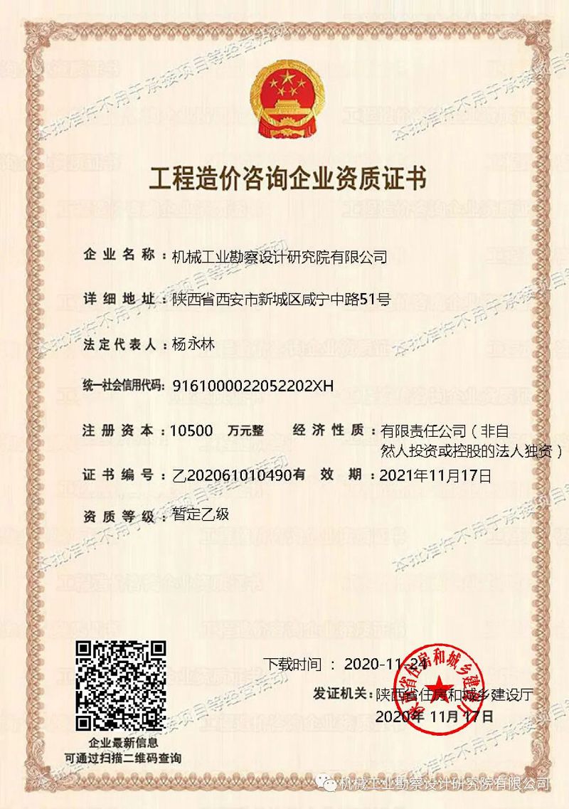截止到目前,我院拥有国家住建部、国家自然资源部等颁发的多项资质,其中甲级11项,乙级及其它类资质20余项,系陕西省人工地基第1检测站所在单位,全过程工程咨询试点企业,房屋建筑和市政基础设施工程总承包试点企业;通过了质量管理体系、环境管理体系和职业健康安全管理体系认证;能为业主提供与工程建设相关的城乡规划、策划咨询、工程勘察、工程设计、工程测绘、工程检测、工程施工、项目管理及工程总承包等全方位、全过程的服务。
