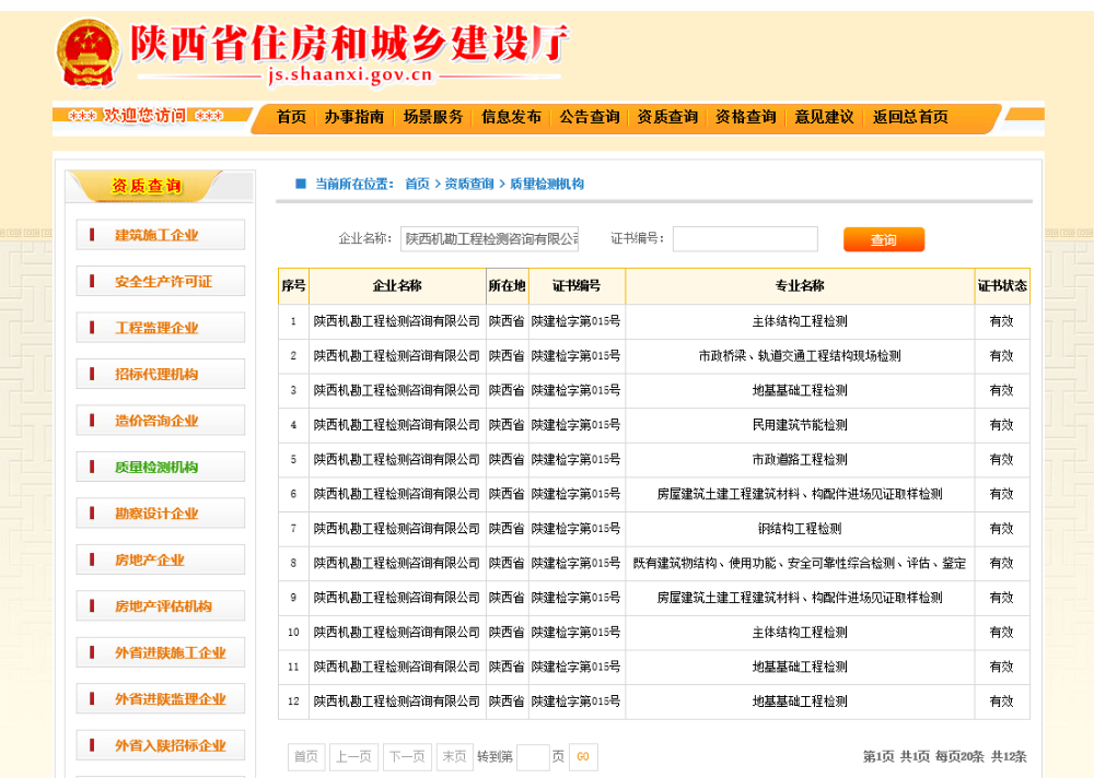 近日,经陕西省质量技术监督局资质认定评审、陕西省住房和城乡建设厅审核批准,机勘院所属陕西机勘工程检测咨询有限公司(简称机勘检测公司)获批市政道路工程检测资质。