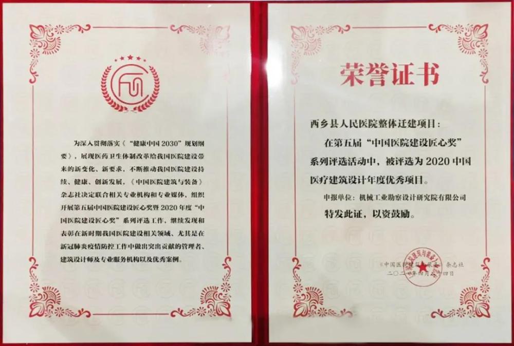 近日,第五届“中国医院建设匠心奖”之2020年中国医疗建筑设计年度优秀项目评选结果揭晓,工程设计院设计完成的西乡县人民医院整体迁建项目,被评选为2020中国医疗建筑设计年度优秀项目。