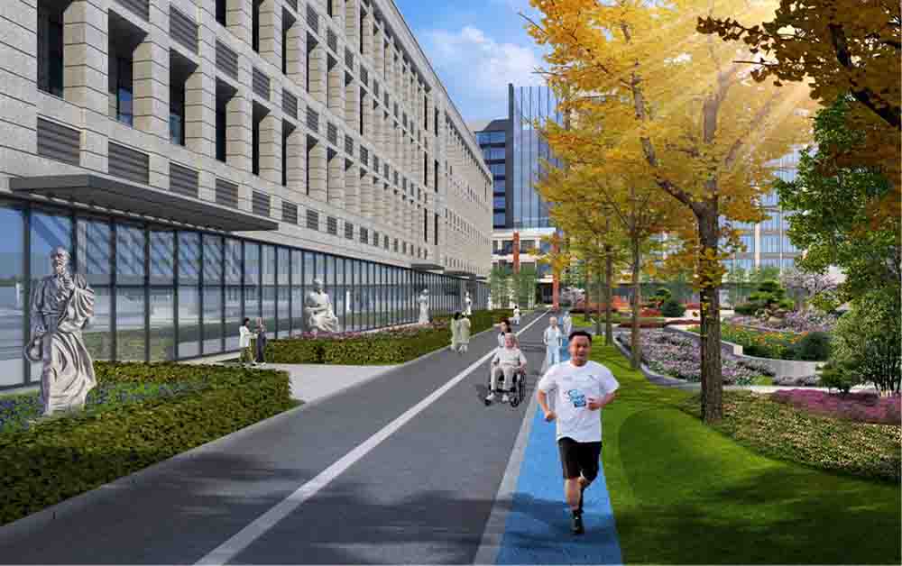 以医疗流程优化为前提,以绿色节能的整体布局为出发点,将中国山水元素、生态花园理念与公共医疗空间相结合,整合自然环境优势,通过地面景观、空中花园的精心塑造,着力打造花园式医疗建筑,院在林中,林在院中,给医护人员和患者提供优质的就医及工作环境。