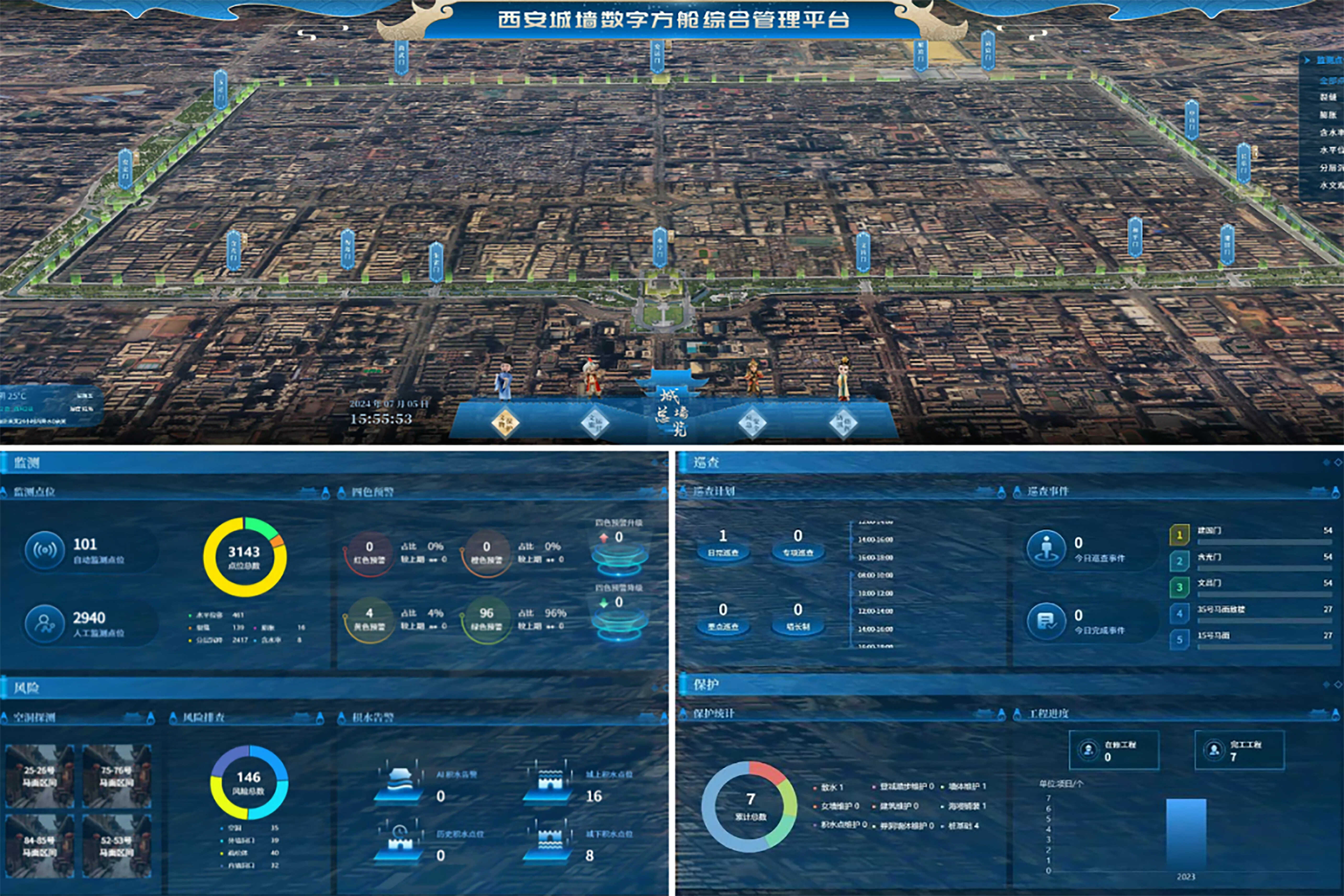 在西安城墙上,3000多个高精度监测点位如“神经元”般密布,实时采集墙体裂缝、沉降变形、温湿度、振动等关键数据,并通过物联网技术实时传输至监测中心。基于人工智能的数据分析平台能够自动识别异常变化,实现对城墙结构安全的24小时不间断智能监控。