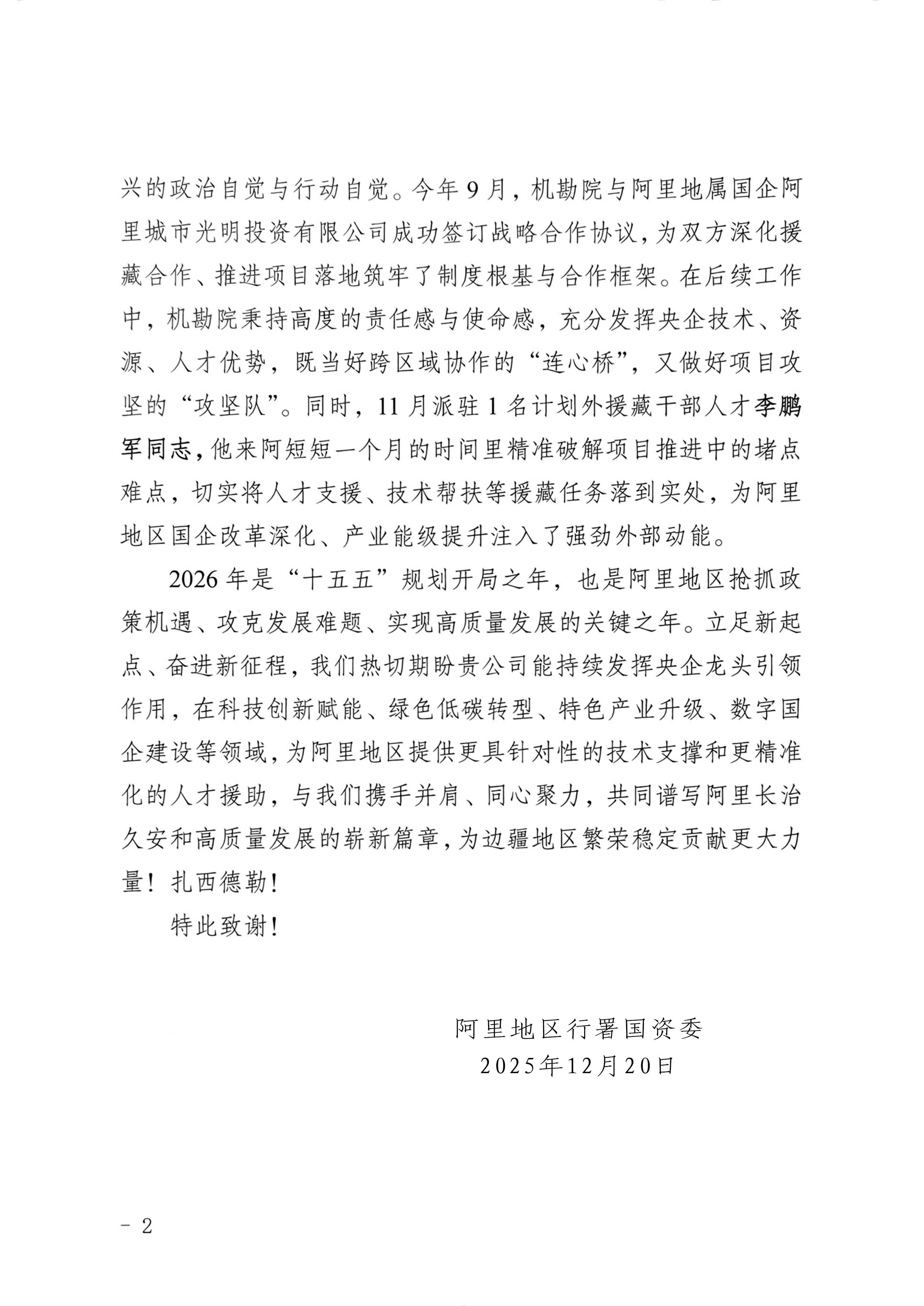 近日,一封来自雪域高原的感谢信跨越千山万水,送达机勘院。这封由阿里地区行政公署国有资产监督管理委员会发来的信函,字里行间满含赞誉,既是对机勘院援藏工作的高度认可,更是陕藏两地同心筑梦、共促发展的生动见证。