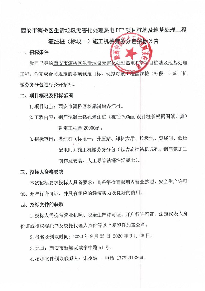 西安市灞桥区生活垃圾无害化处理热电PPP项目桩基及地基处理工程灌注桩(标段一)施工机械劳务分包招标公告