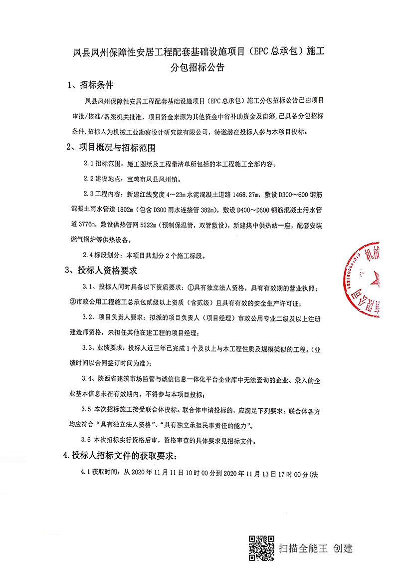 凤县凤州镇保障房配套基础设施建设项目(EPC总承包)施工分包招标公告