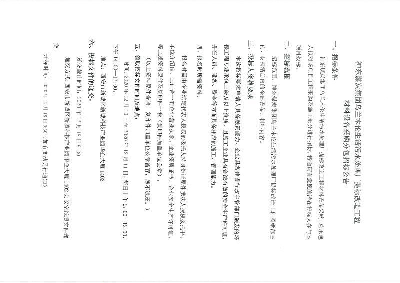 神东煤炭集团乌兰木伦生活污水处理厂提标改造工程材料设备采购分包招标公告