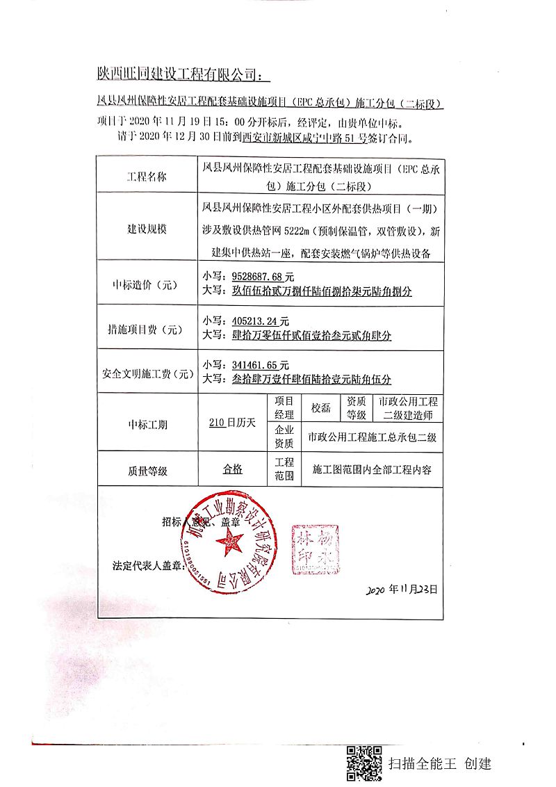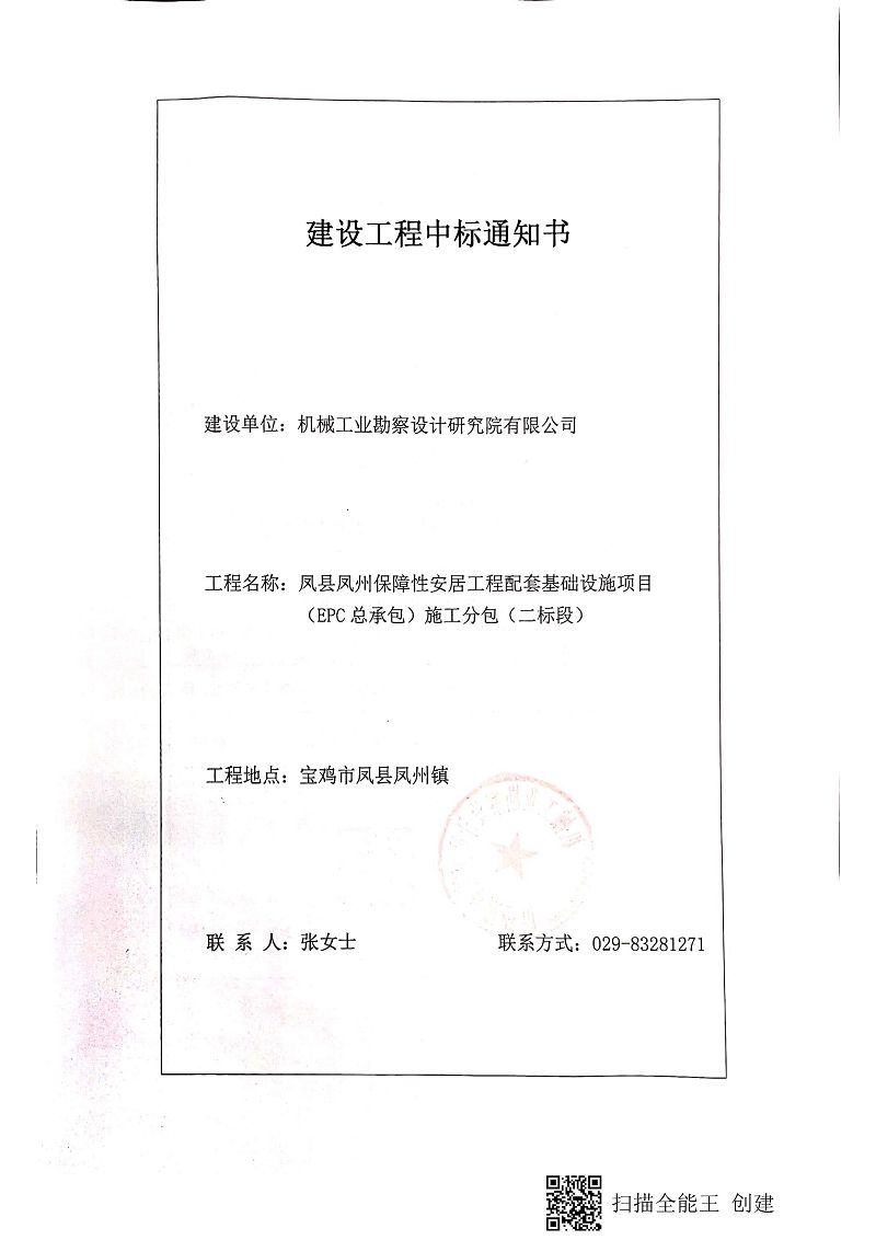 凤县凤州保障性安居工程配套基础设施项目(EPC总承包)施工分包(二标段)中标通知书