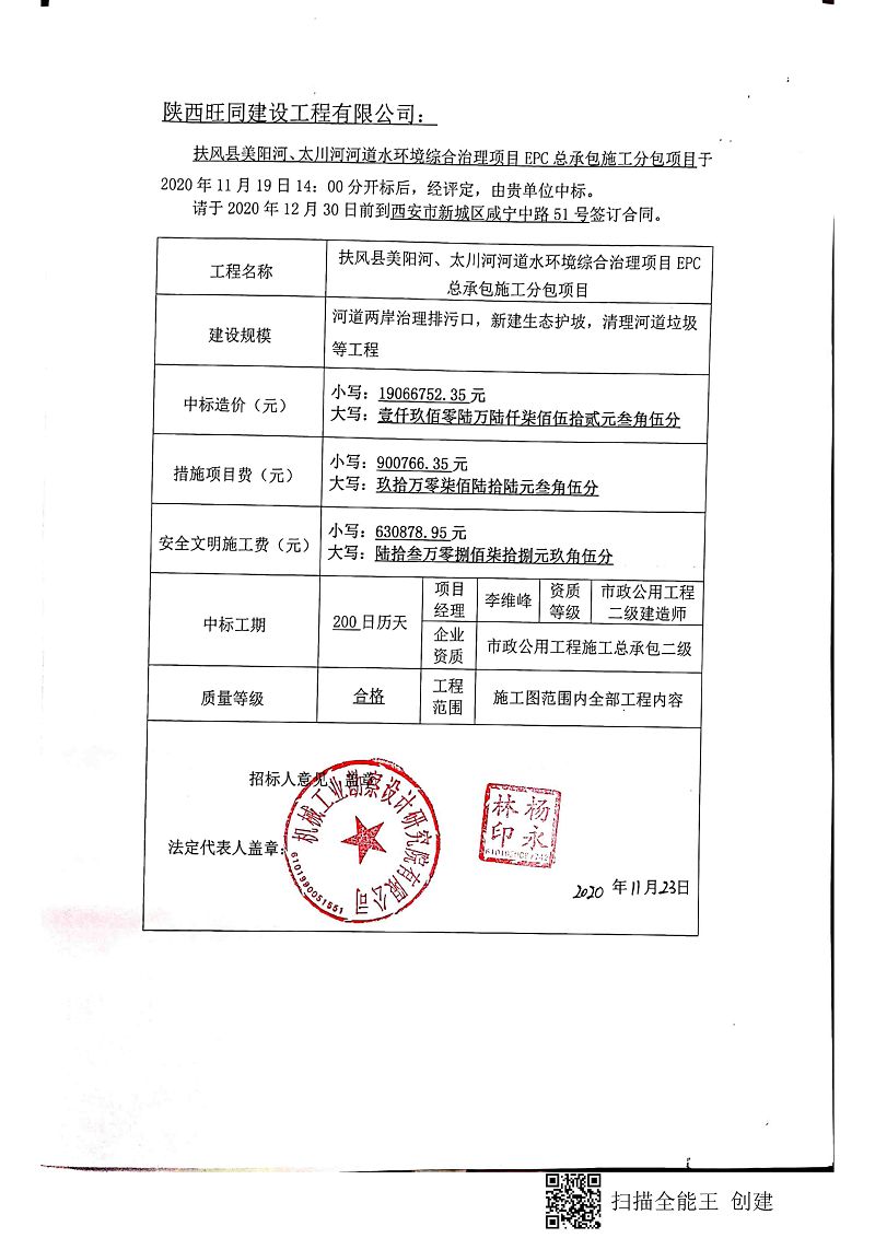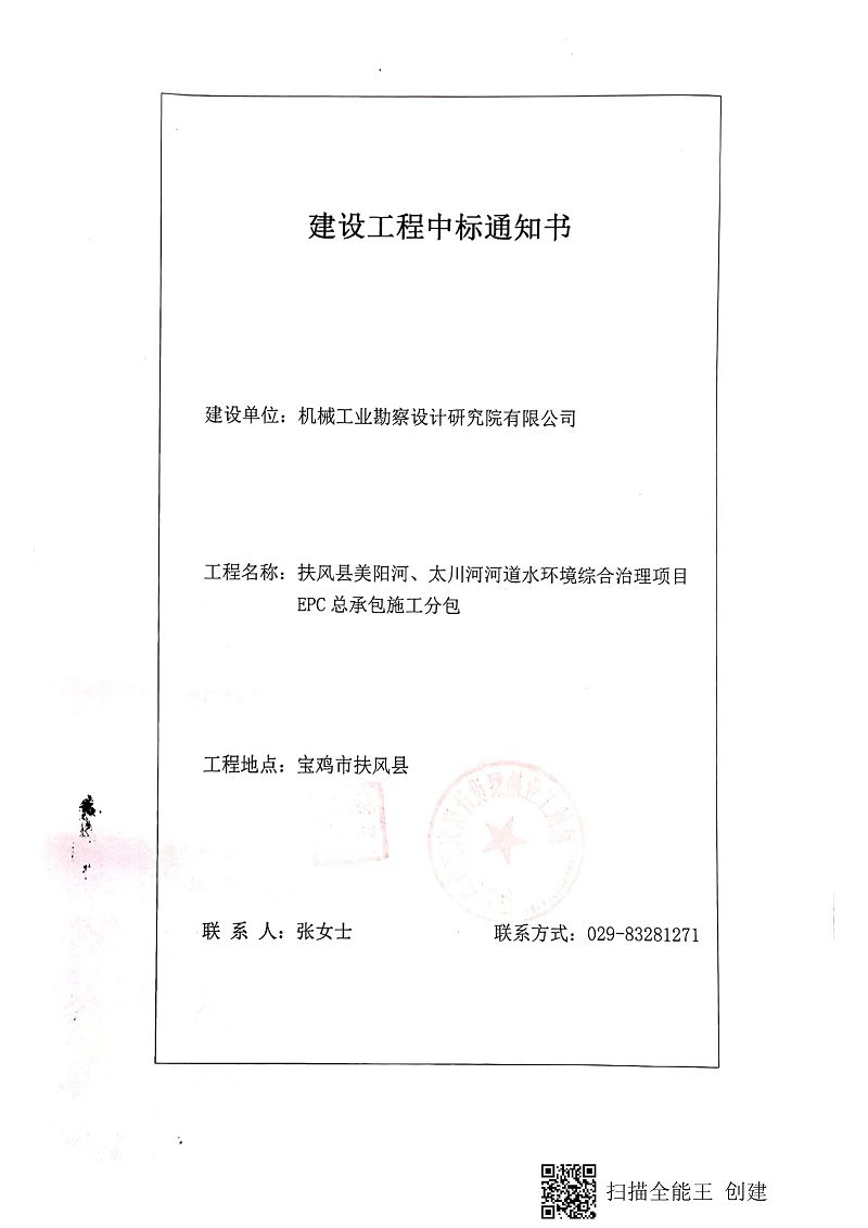 扶风县美阳河、太川河河道水环境综合治理项目EPC总承包施工分包中标通知书