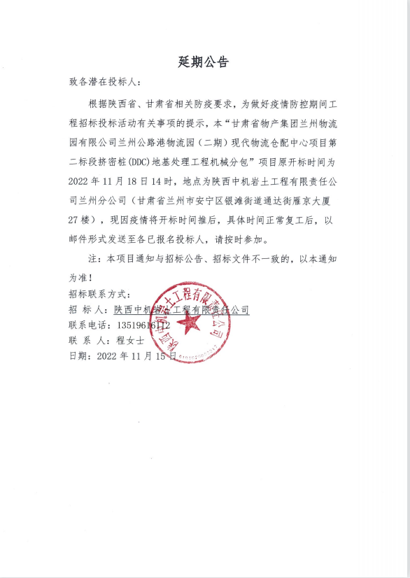 甘肃省物产集团兰州物流园有限公司兰州公路港物流园(二期)现代物流仓配中心项目第二标段挤密桩(DDC)地基处理工程机械分包-招标延期公告
