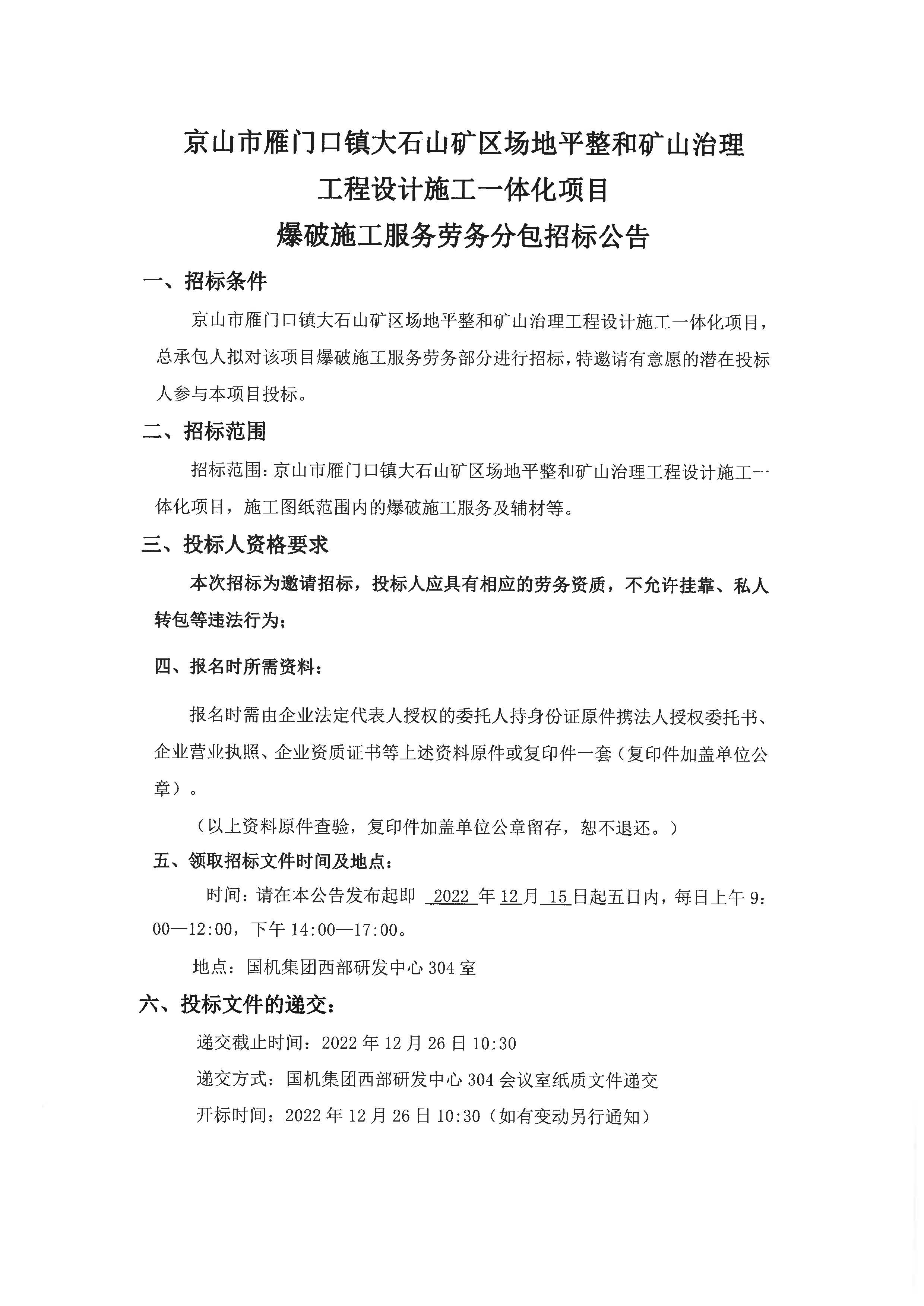 京山市雁门口镇大石山场地平整和矿山治理爆破施工服务劳务分包招标公告