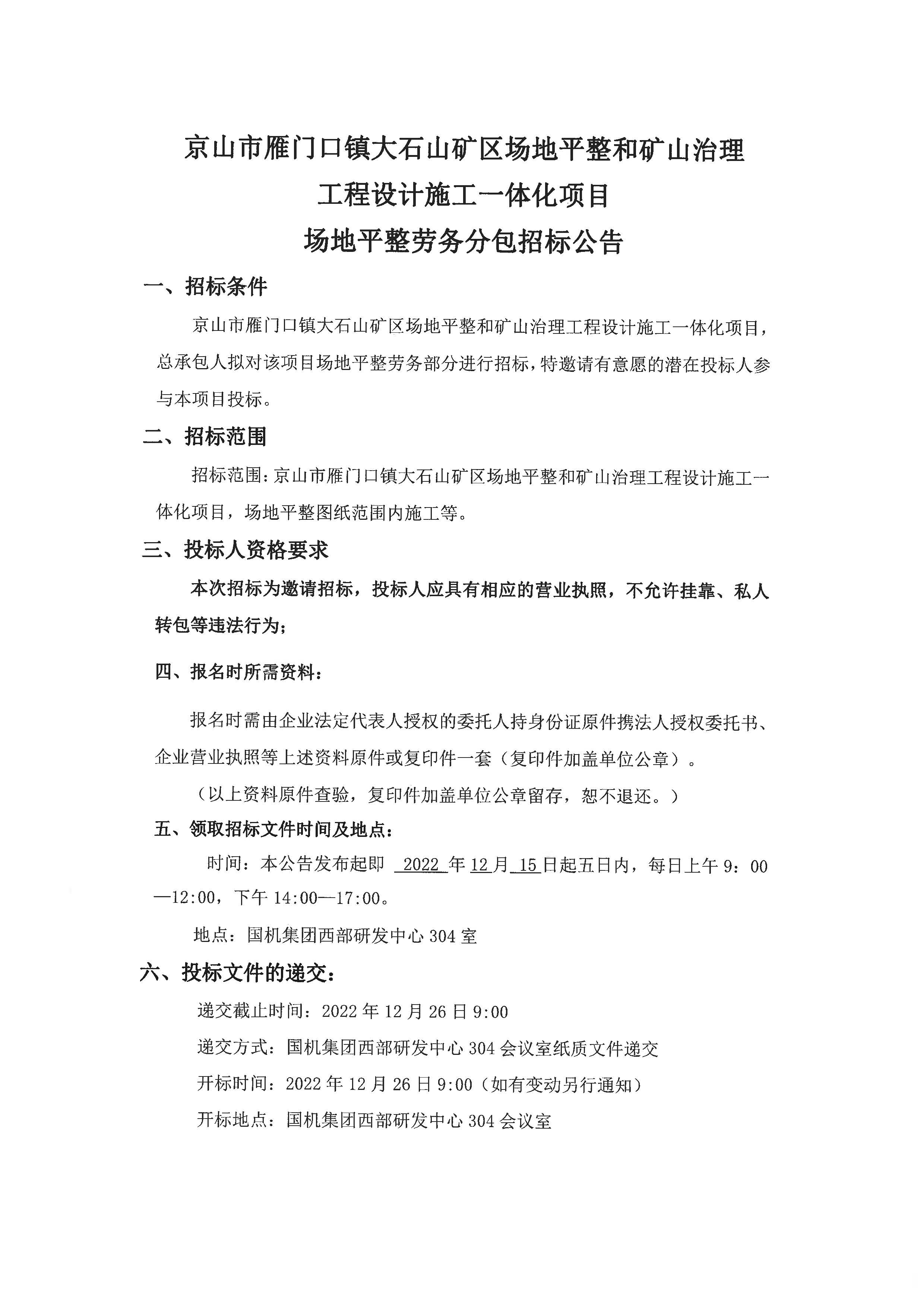 京山市雁门口镇大石山矿区场地平整和矿山治理劳务场地平整劳务分包招标公告