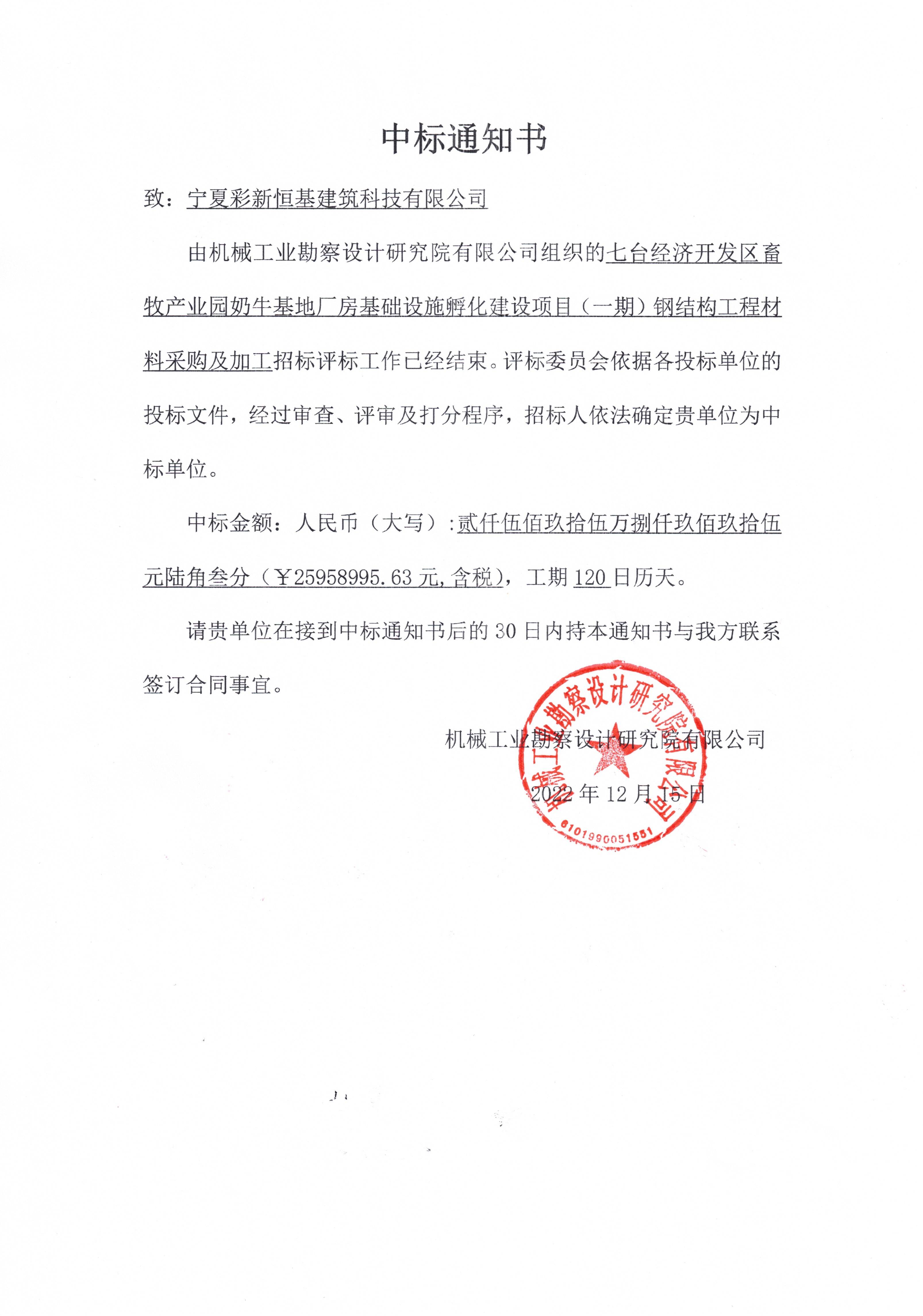 七台河经济开发区畜牧产业园奶牛基地厂房基础设施孵化器建设项目(一期)钢结构采购及加工-中标通知书