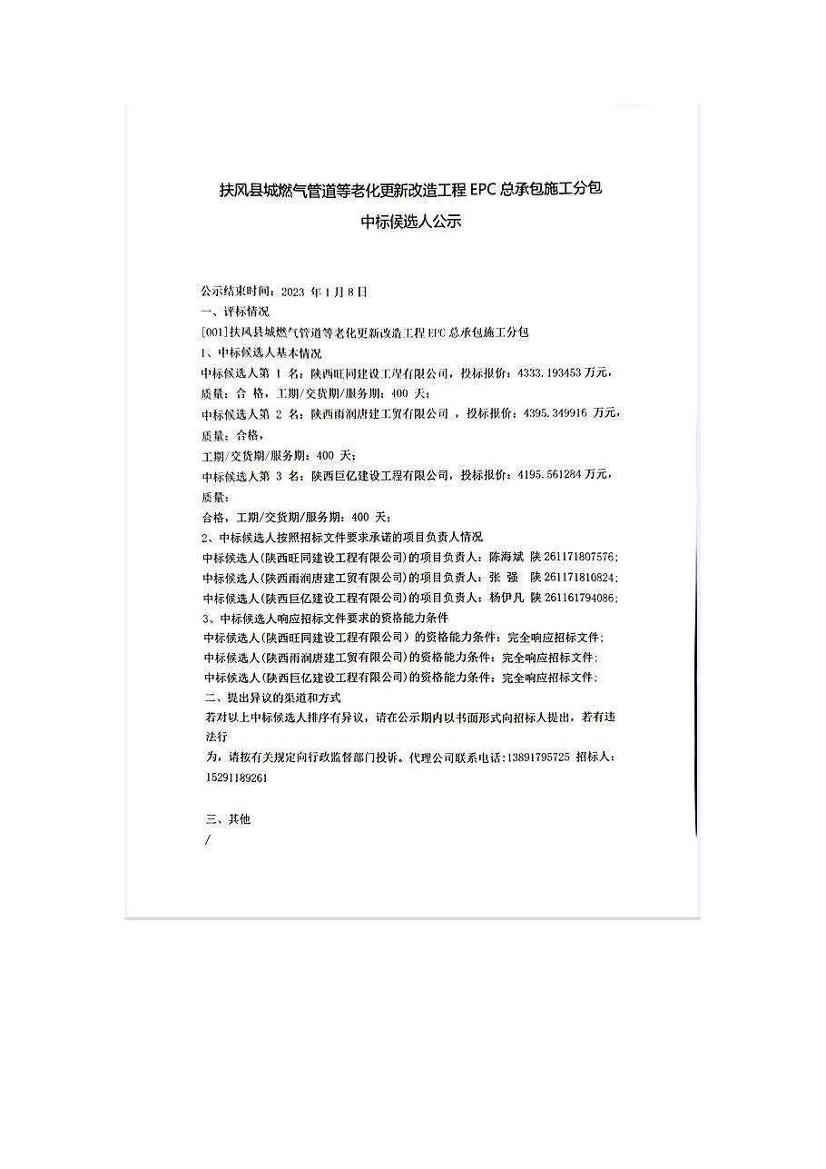 扶风县城燃气管道等老化更新改造工程EPC总承包施工分包中标候选人公示
